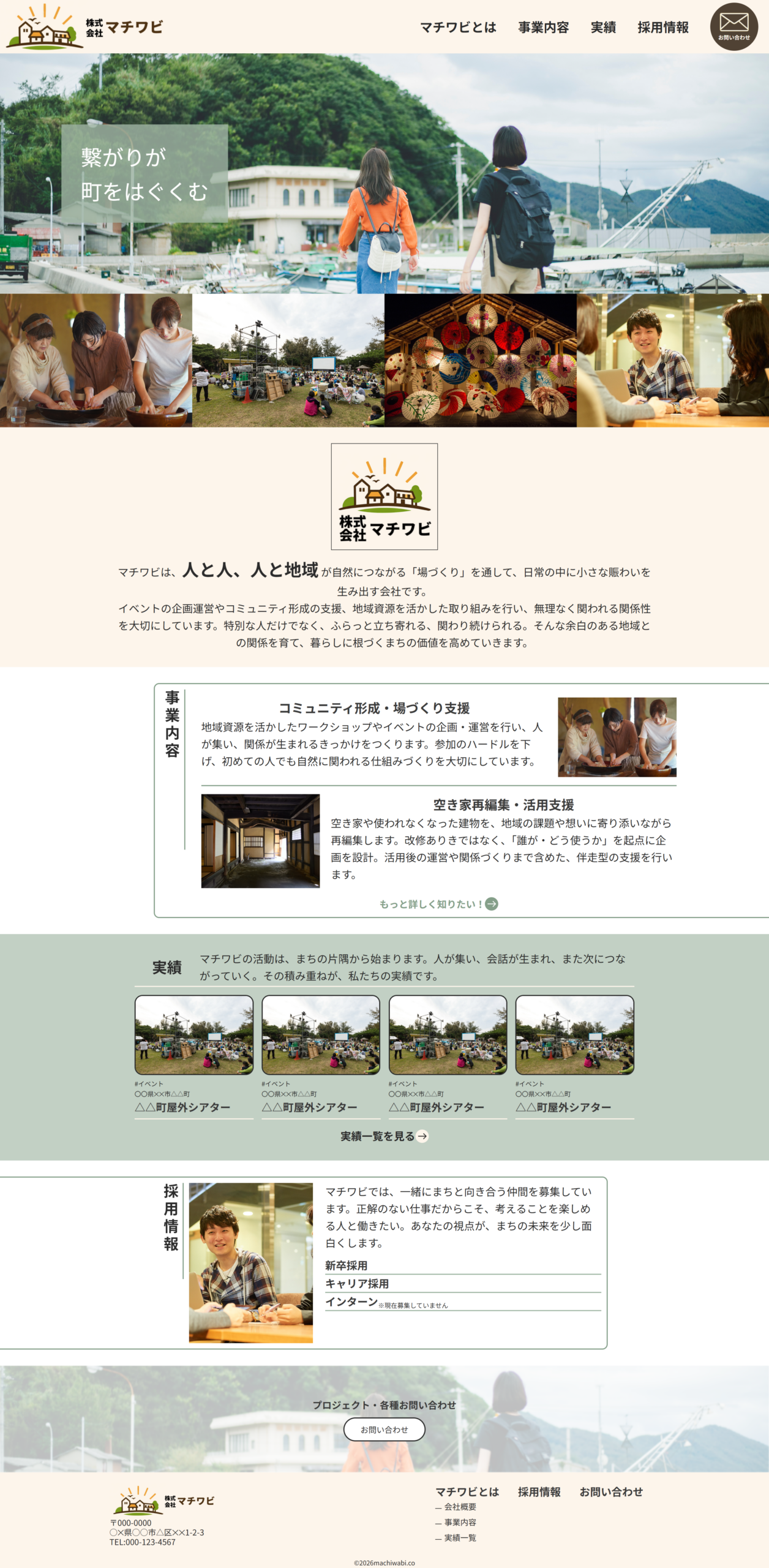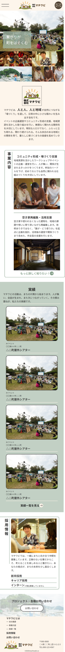 | デザイン | 地域に寄り添う企業としての温かさと誠実さが伝わるよう、余白を活かした落ち着きのあるレイアウトとや若い印象を与えられる配色を基調に設計しました。画像をファーストビューや事例など多数のセクションに配置させることで、文字だけに頼らずに活動の空気感や人の存在を感じられる後世にしています。 |