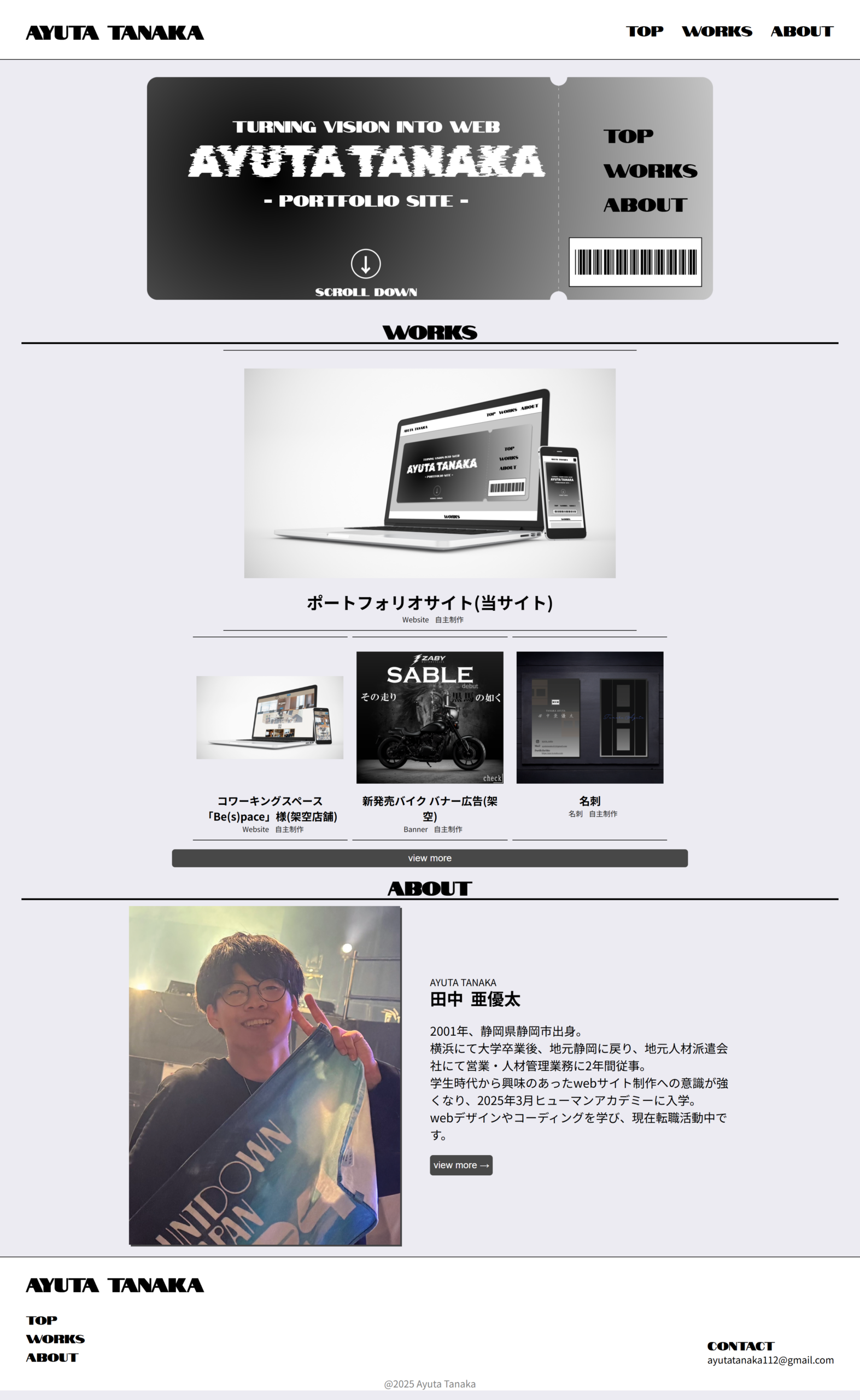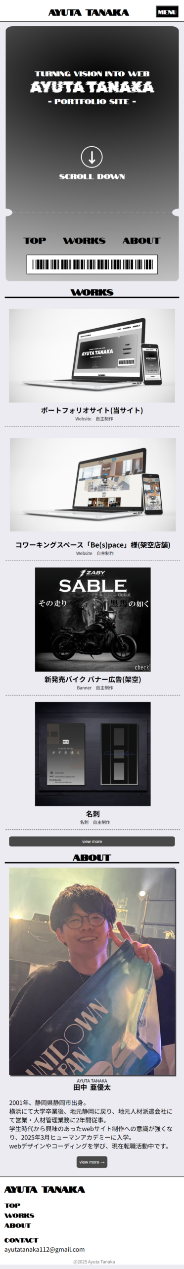 | 情報設計 | 採用担当者様に最初に何ができるのかを知っていただけるよう、最初にWorksセクションを配置。Worksは最新の制作物が一番上に並ぶようにし、各作品の詳細ページでは5W1Hを意識して制作物の詳細を記述しました。 また、wordpressの反映をしています。 その次にAboutセクションを配置。Topページでは簡易的な説明のみにし、Aboutページでは、自身のどのような人間で何ができるのか、これまでの経験から何を強みとしているのかを詳細に理解していただけるようにしました。 |